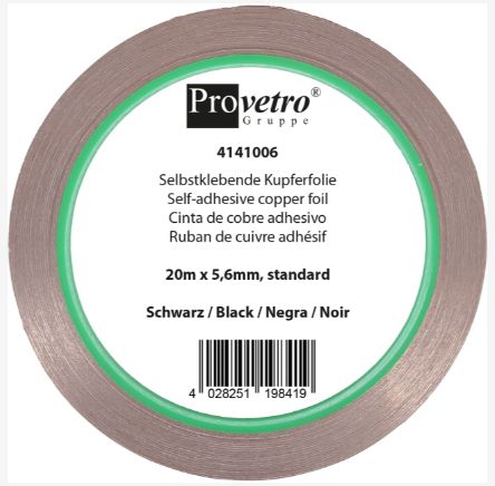 Bakrena folija crna, samoljepljiva dimenzije 20 x 5,6 mm. Koristi se u tiffany tehnici, fuziji stakla...