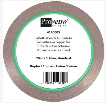 Bakrena folija obična, samoljepljiva dimenzije 20 x 5,2 mm. Koristi se u tiffany tehnici, fuziji stakla...