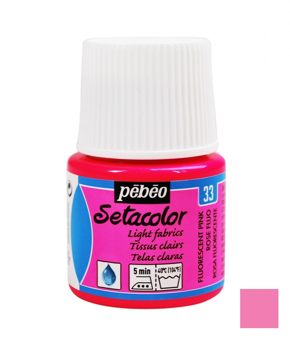 Setacolor fluorescentne boje za oslikavanje svijetlih tkanina. Boje imaju laganu teksturu tako da se neće promijeniti fleksibilnost i mekoća i najosjetljivijih tkanina. Nanose se kistom, spužvastim valjkom, sitotiskom, pečatima, preko šablona...