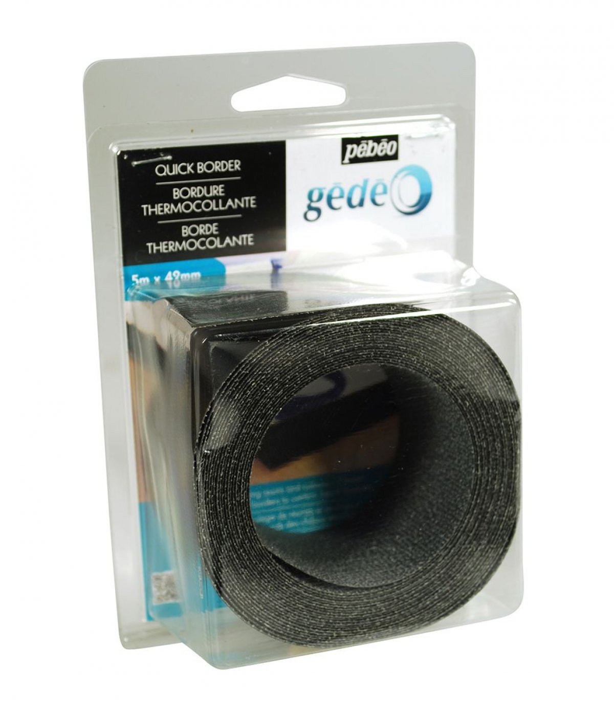 Crna traka za platna koristi se za Mixedmedia tehniku kako bi spriječila curenje medija, boje ili kristalne smole sa platna. Izmijerite opseg tj. vanjski rub napetog platna. Stavite traku na rub platna i fiksirajte ju glačalom na 180°C. Ne glačajte direktno na crnu traku već između glačala i trake stavite komad tkanine. S unutarnje strane, utor između platna i crne trake ispunite prozirnom kontur pastom kako ne bi došlo do prelijevanja pri korištenju tekućih materijala. Pripremljenu podlogu ispunite smolama i bojama po želji. U pakiranje je 5m trake.