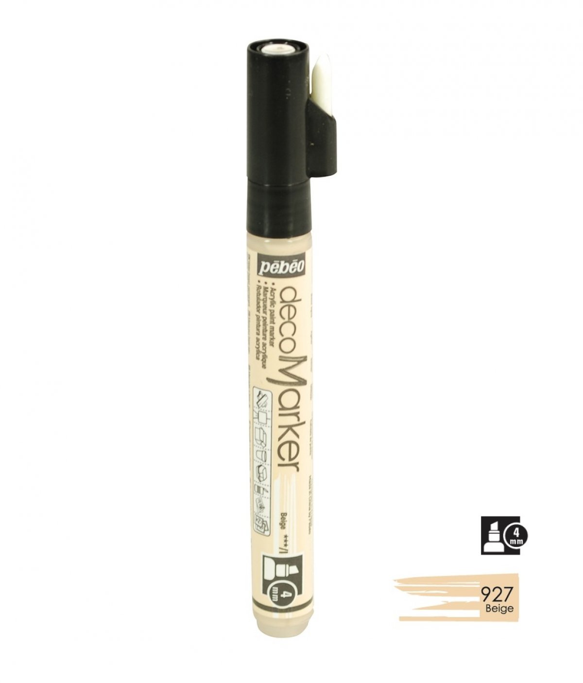Akrilni marker na bazi vode sa kosim vrhom 4mm. Koristi se za crtanje, pisanje, slikanje, dekoriranje na različitim podlogama ukljčujući papir, karton, staklo, metal, keramiku, plastiku, platno... Za porozne površine poput drva i gipsa najprije treba nanijeti jedan sloj bijelog gessa. Prije upotrebe marker dobro protresti. Kako bi boja krenula potrebno je na komadiću papira pritisnuti vrhom markera nekoliko puta. Prije dekoriranja napravite test na željenoj površini. Nakon upotrebe markeri se odlažu vodoravno. Brzo se suši, na dodir u roku od 30 minuta, a potpuno od 6-12 sati. Nakon sušenja boje su pokrivne, intenzivne i trajne. Marker je potpuno iskoristiv jer u pakiranju dolazi rezervni vrh, u slučaju da se ošteti, može se lako zamijeniti.