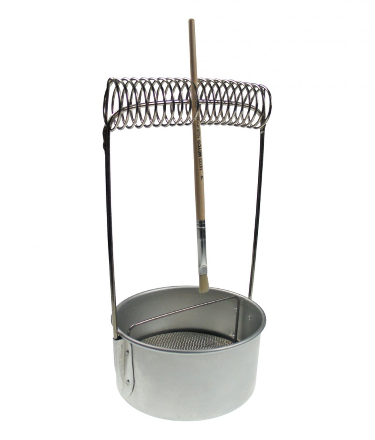 Metalni držač za kistove promjera 11cm, dimenzije posude 18x20cm, ima posebno osmišljeni stalak u obliku opruge prilgođen svakoj veličini kista. Oprane kistove stavite na stalak kako bi se što prije ocijedili i osušili. Cijeđenje kistova na ovaj način čuva dlaku kista i zadržava oblik.