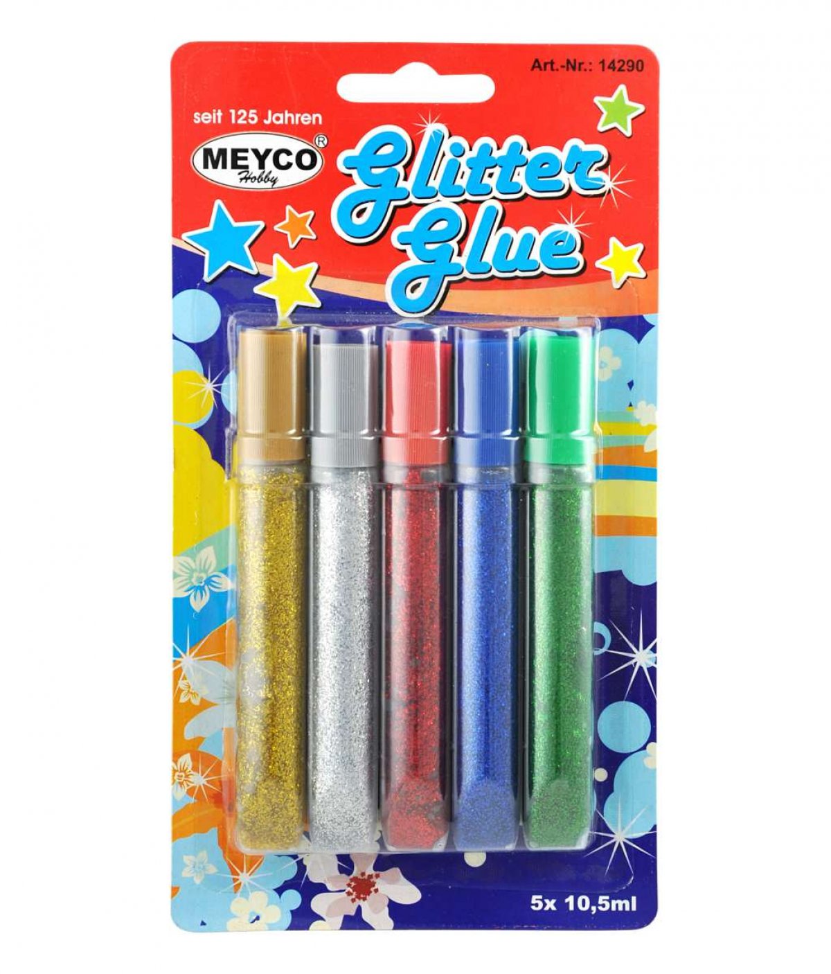 Univerzalno glitter ljepilo za lijepljenje papira, kartona... U pakiranju je 5 tubica po 10,5ml u srebrnoj, zlatnoj, crvenoj, plavoj i zelenoj boji.