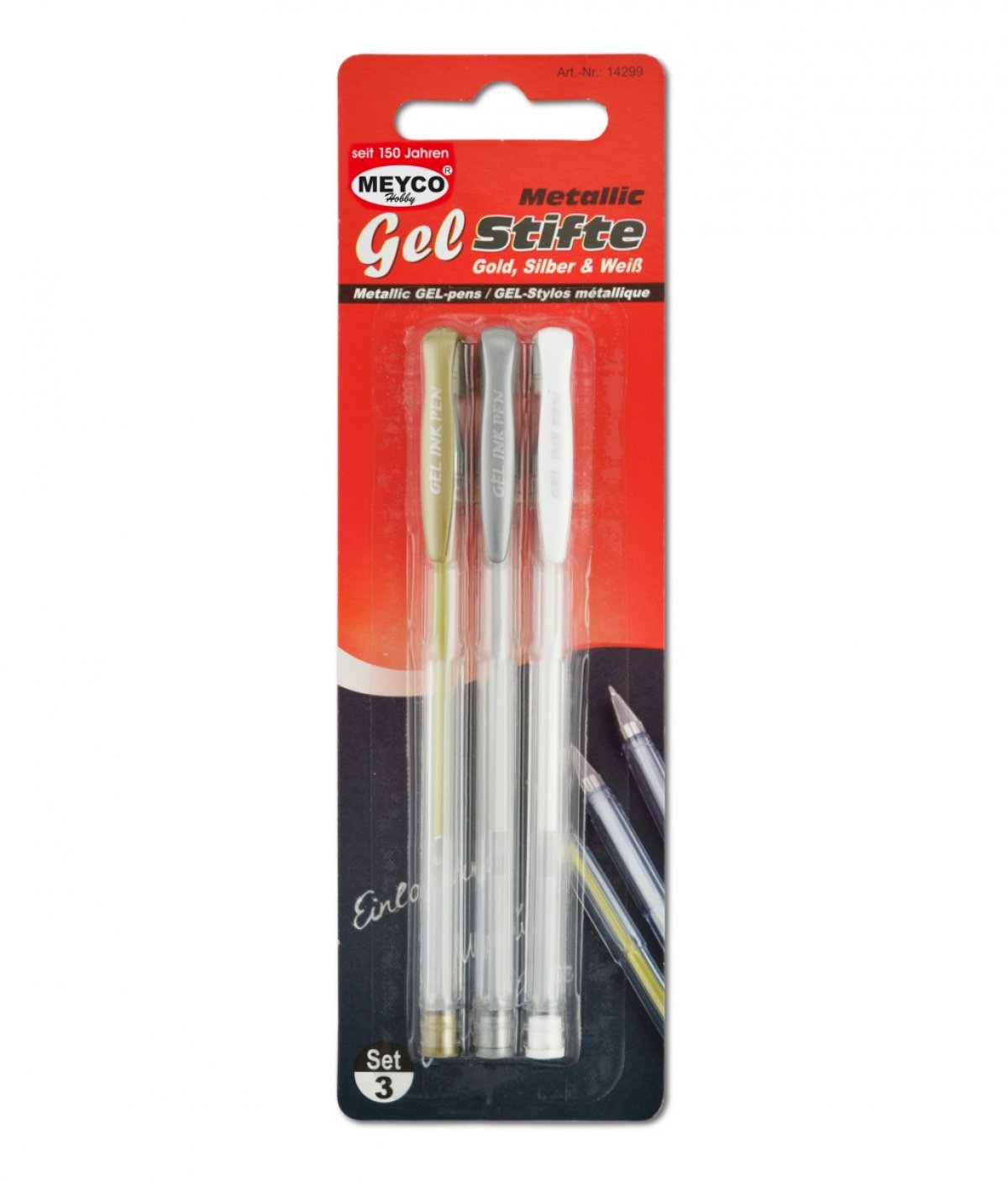 Metalik gel kemijske olovke za pisanje, crtanje, ukrašavanje, podcrtavanje... U setu su tri olovke u zlatnoj, srebrnoj i bijeloj boji.