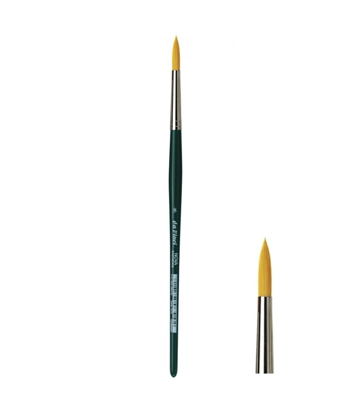 OBLIK: okrugli kist s dlakom srednje dužine, zelena polirana kratka drška. Metalni okrugli prsten obložen niklom. U presjeku metalnog prstena kista, većina Da Vinci kistova ima i za trećinu duže dlake unutar prstena u odnosu na druge koji imaju dlake tek od konusnog dijela prstena. Ovakav tip izrade kista omogućuje dugotrajnost, gipkost i elastičnost.