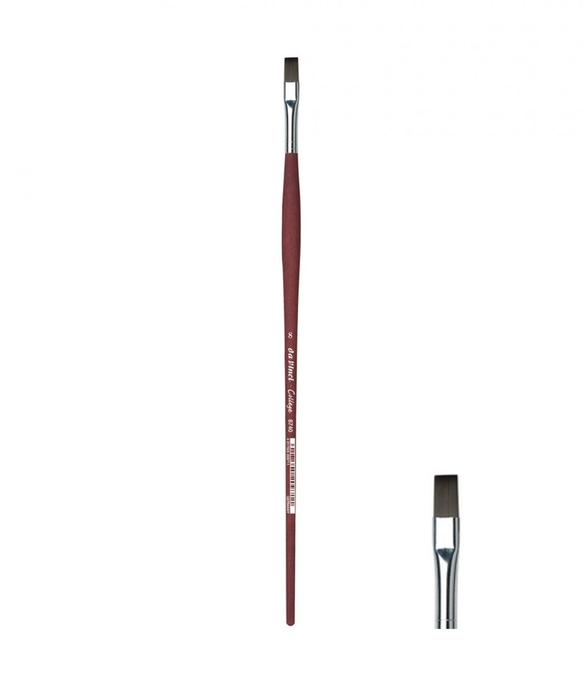 OBLIK: plosnati kist sa finim sintetskim dlakama, posebno dizajnirana mat crveno-smeđa drška koja ne klizi u ruci. Konusni aluminijski okrugli prsten .U presjeku metalnog prstena kista, većina Da Vinci kistova ima i za trećinu duže dlake unutar prstena u odnosu na druge koji imaju dlake tek od konusnog dijela prstena. Ovakav tip izrade kista omogućuje dugotrajnost, gipkost i elastičnost.