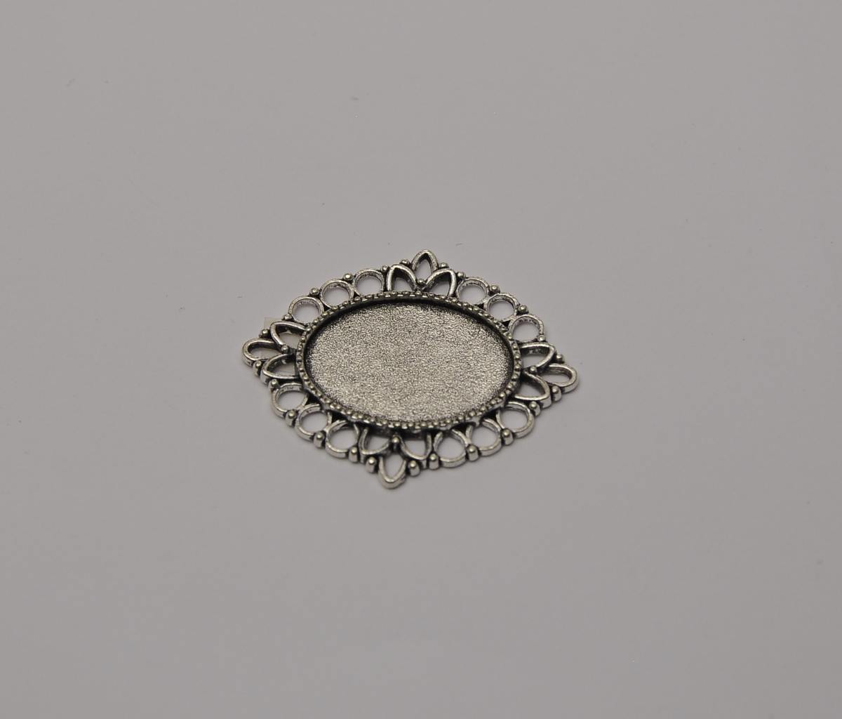 Metalni ovalni medaljon za izradu nakita u srebrnoj boji, dimenzije 4x3,5cm. Može se patinirati, ukrasiti decoupage tehnikom ili staviti fotografija, puniti Vitrail, Ceramic, Prisma, Moon efektnim bojama. Za 3D efekt, preko željenog motiva ili suhe boje..