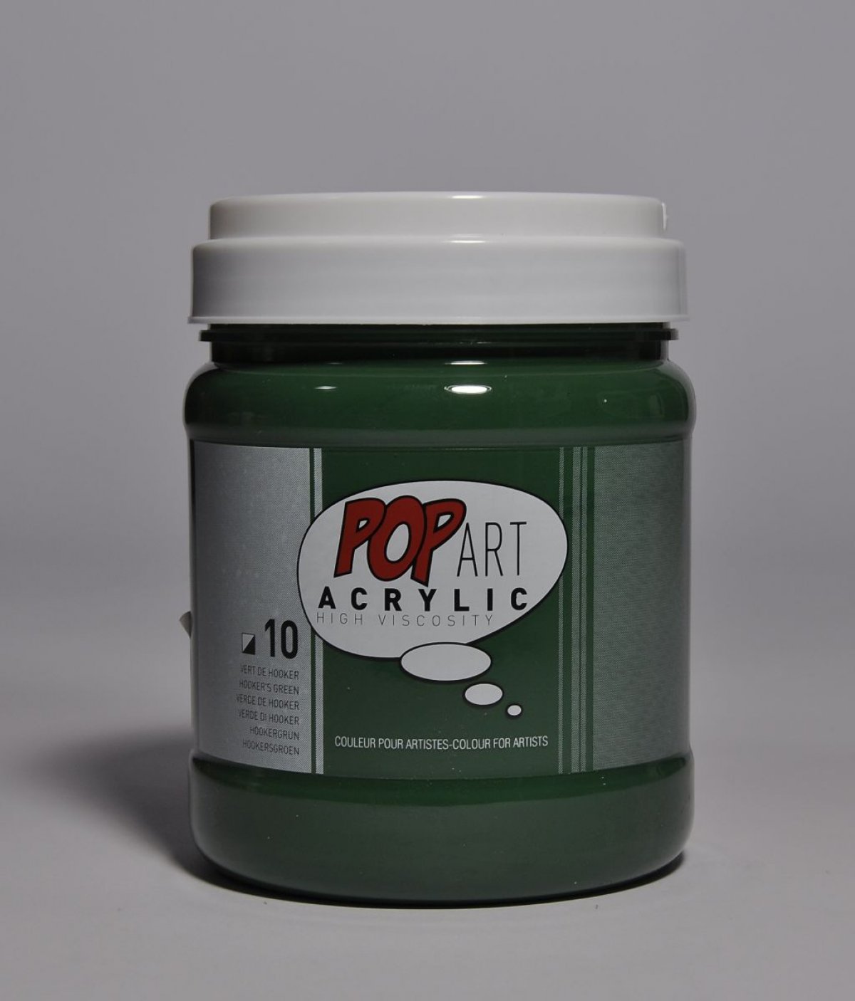 Pop art akrilne boje pogodne su za oslikavanje većih površina. Idealne su za slikarske tehnike, Mixedmediu, hobby, salvetnu tehniku... Intenzivne, satenske boje na bazi vode, odlične pokrivnosti, bez neugodnog mirisa. Mogu se nanositi kistom, valjkom ili špahtlama na sve podloge; platno, drvo, gips, stiropor, metal, keramika, plastika, karton... Mogu se međusobno miješati, a ovisno o željenom efektu mogu im se dodavati razni mediji. Paleta se sastoji od 15 osnovnih boja, 2 metalik i 1 sedefaste
