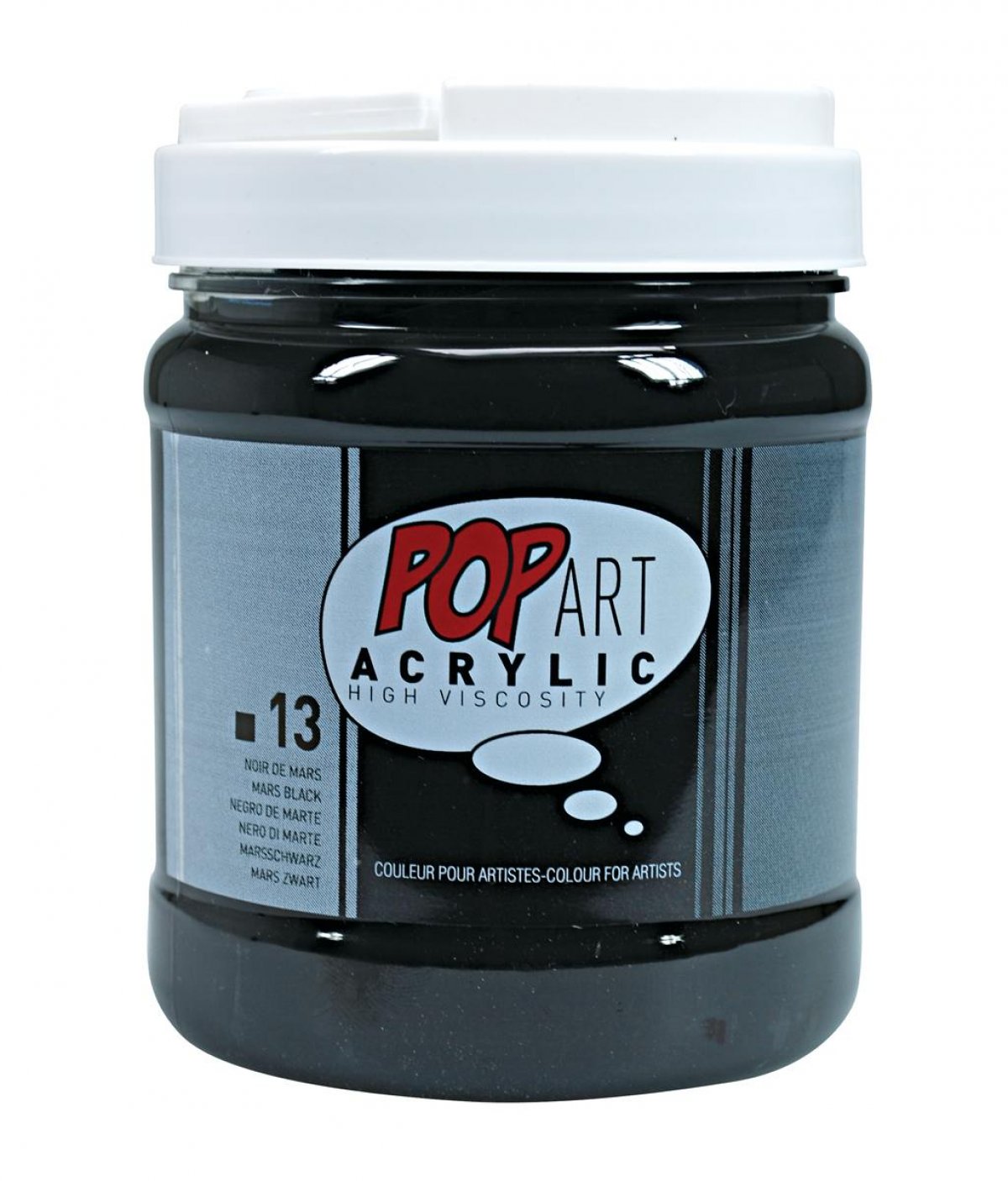 Pop art akrilne boje pogodne su za oslikavanje većih površina. Idealne su za slikarske tehnike, Mixedmediu, hobby, salvetnu tehniku... Intenzivne, satenske boje na bazi vode, odlične pokrivnosti, bez neugodnog mirisa. Mogu se nanositi kistom, valjkom ili špahtlama na sve podloge; platno, drvo, gips, stiropor, metal, keramika, plastika, karton... Mogu se međusobno miješati, a ovisno o željenom efektu mogu im se dodavati razni mediji. Paleta se sastoji od 15 osnovnih boja, 2 metalik i 1 sedefaste.