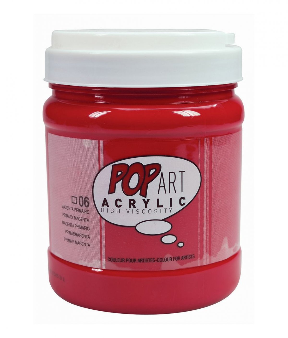 Pop art akrilne boje pogodne su za oslikavanje većih površina. Idealne su za slikarske tehnike, Mixedmediu, hobby, salvetnu tehniku... Intenzivne, satenske boje na bazi vode, odlične pokrivnosti, bez neugodnog mirisa. Mogu se nanositi kistom, valjkom ili špahtlama na sve podloge; platno, drvo, gips, stiropor, metal, keramika, plastika, karton... Mogu se međusobno miješati, a ovisno o željenom efektu mogu im se dodavati razni mediji. Paleta se sastoji od 15 osnovnih boja, 2 metalik i 1 sedefaste.